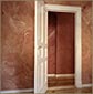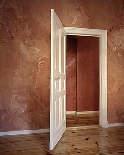 Tür ist die purpurrote Wand des Flures zu sehen.