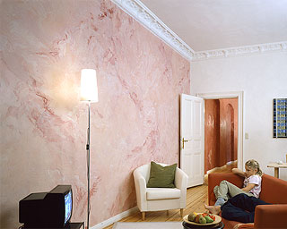 Die Wand links im Raum interpretiert eine Marmorstruktur