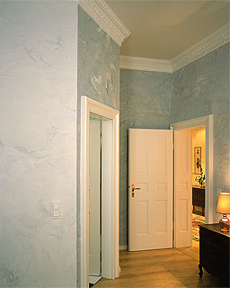 Der dominierende Ton in diesem Schlafzimmer ist ein sanftes, luftiges Blau, das einen ruhigen, erholsamen Schlaf unterstützt.